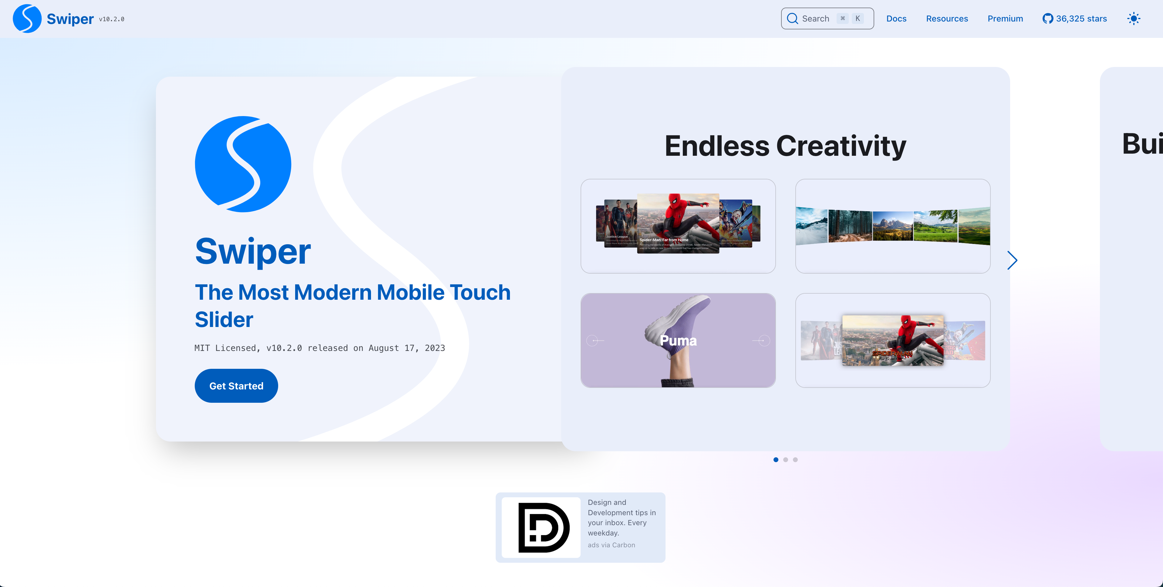 JavaScriptの高機能なスライドショー用のライブラリSwiperの公式サイトです。