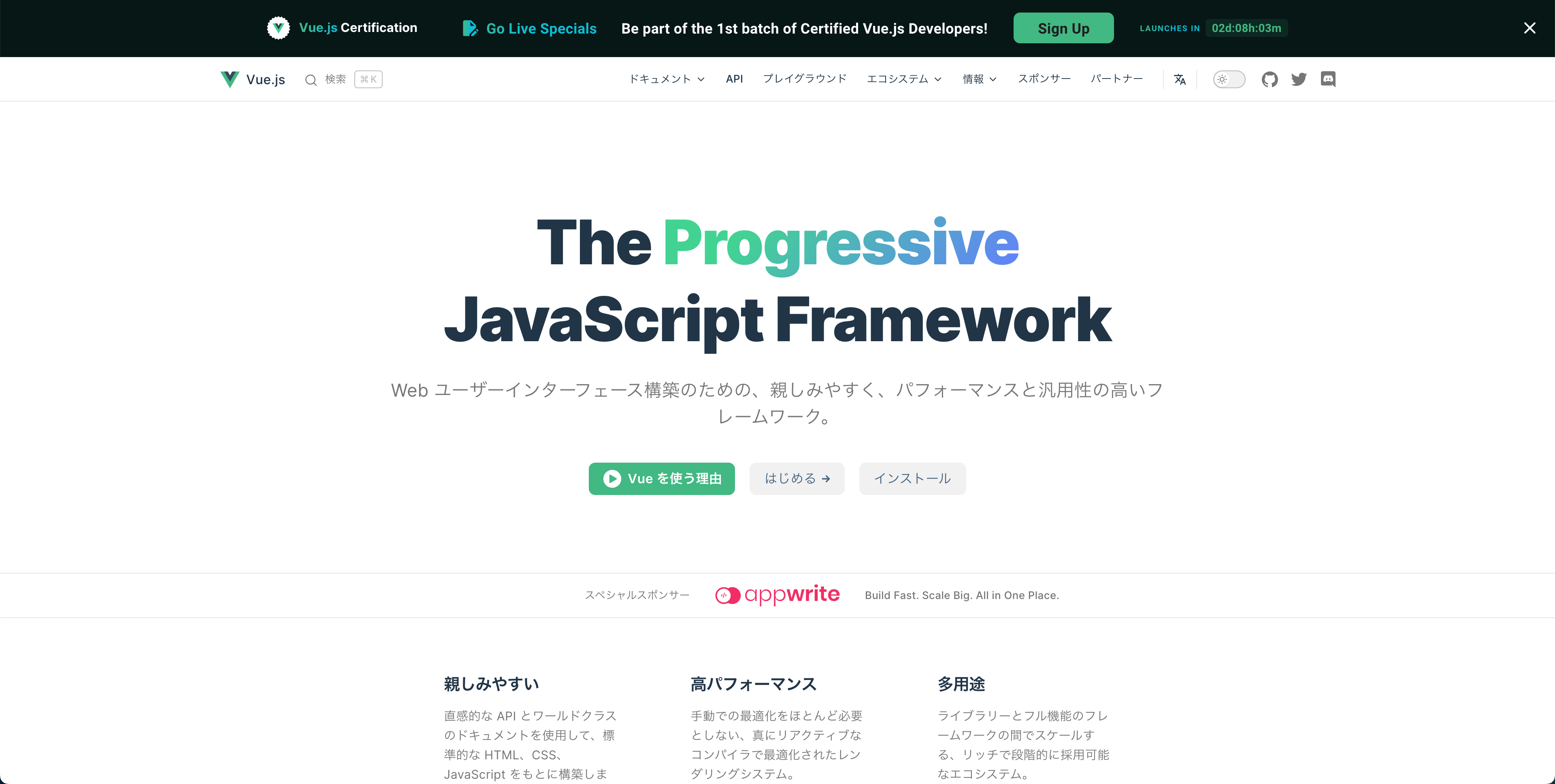 JavaScriptのフレームワークであるVuejs公式サイトです。
